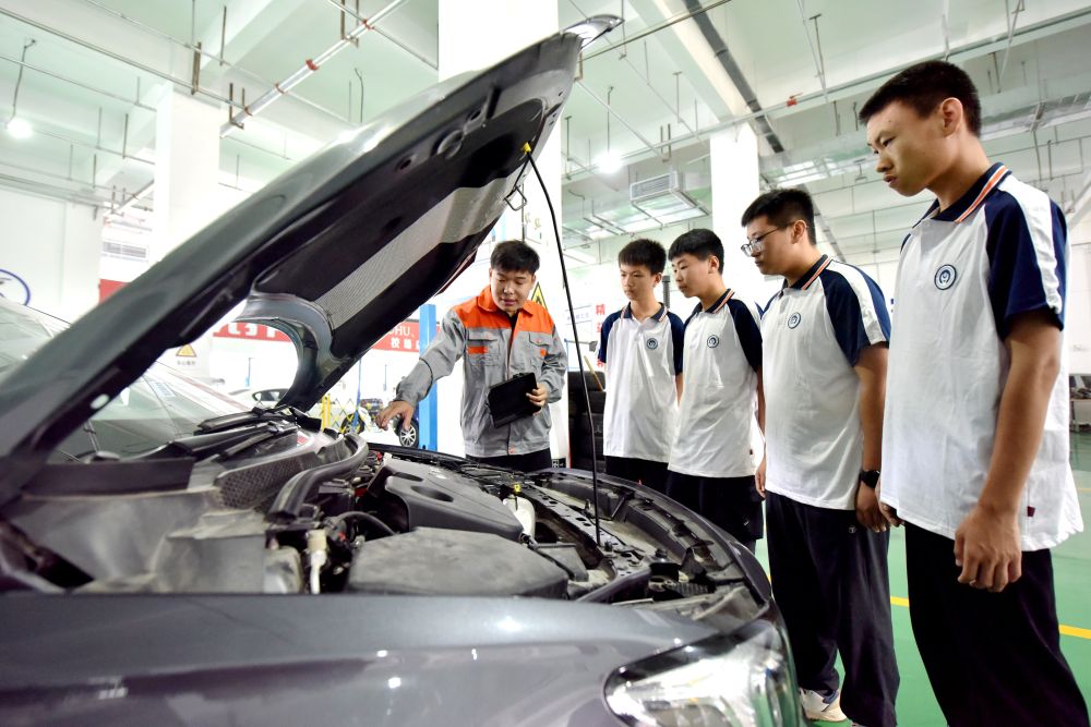 2024年6月7日,河北省邢臺市威縣職業(yè)技術(shù)教育中心教師在指導(dǎo)學(xué)生學(xué)習(xí)汽車維修技術(shù)。